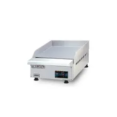 Electric griddle with smooth surface for diverse cooking. High-quality Malaysian-made, durable for restaurants. 90 cm width provides large cooking area. 5250W power for fast and efficient heating. Precise temperature control from 50°C to 300°C. 12 mm thick plate for stable heat distribution. Constructed from stainless steel for easy cleaning. Equipped with high splash guards to prevent grease splatter. Includes a grease drip tray for convenient cleaning. Ideal for burgers and dishes requiring even browning.