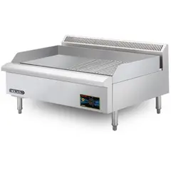 Char rock broiler for rich, traditional flavor. High-quality Malaysian-made, extremely durable. Fully constructed from stainless steel for easy cleaning. Two high-performance burners for precise heat control. Automatic piezo igniter for easy and safe startup. Compact design fits various kitchen spaces well. Aerated pilots ensure even and efficient heat distribution. Removable grease tray simplifies cleaning process. 60,000 BTU/hr thermal capacity for powerful performance. Rear gas connection reduces fuel consumption.