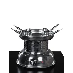 Premium stainless steel decorative piece proudly made in Saudi Arabia. Equipped with high quality German EGO heating plate technology. Features precise German EGO thermostat for accurate temperature control. Upper part constructed of two layers including thermal insulation. Versatile operation allows usage with or without heating sand. Includes four stainless steel coffee pots for immediate brewing. Powerful 1500 watt element ensures rapid sand heating daily. Heavy duty electrical components designed for rigorous commercial use. Compact 18cm diameter heating tile fits limited counter spaces. Stylish design enhances the ambiance of traditional coffee shops.