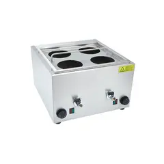 High cooking capacity, ideal for busy commercial kitchens. Durable stainless-steel construction ensures hygiene and longevity. Optimized heat distribution with a U-shaped heating pipe. Precise temperature control from 30°C to 110°C. Equipped with 4 cooking baskets and a hot soup boiler. Compact design saves space and fits various kitchen setups. 3KW power ensures fast heating and consistent cooking results. Convenient water management with a separate drainage tap. Easy to clean with a nickel-coated wire mesh screen.