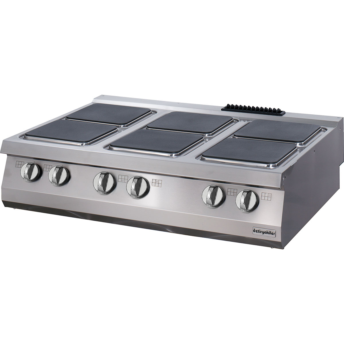 - Heavy duty electric boiling top featuring 6 square cast iron hot plates.