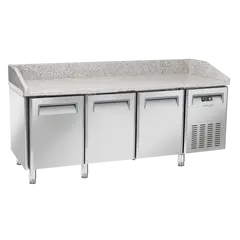الهيكل الخارجي والداخلي مصنوع من الفولاذ المقاوم للصدأ  سطح العرض من الجرانيت مع لوحة خلفية بارتفاع 200 مم تبريد بالتهوية مع محرك بنظام كاسيت إزالة الصقيع دورة تلقائية الضاغط مادة النفخ سيكلوبنتان (60 مم لكل جانب) مبخر مع معالجة ضد التآكل ترموستات ديجيتال 3 أرفف قابلة للتعديل 600x400 مم 6 دعائم غير قابلة للصدأ قابلة للتعديل (عجلات قابلة للقفل كخيار إضافي) حشية قابلة للإزالة باب يغلق ذاتيا (غير معكوس) مجموعة واحدة من قضبان التوجيه على شكل حرف "C" لكل باب مناسبة لتخزين إضافات البيتزا المبردة